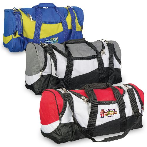 600D polyester with PVC backing. U-shaped opening. Zippered end compartments. Webbing handles with Velcro cuff. Removable, adjustable webbing shoulder strap. Studded base for durability. Baseboard.